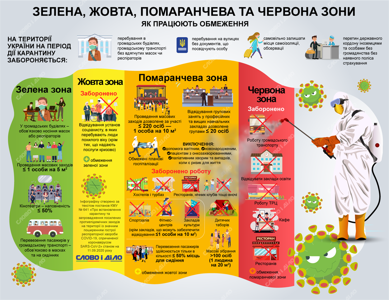 Згідно з постановою Кабміну, «зелений» або «жовтий» рівні карантинних обмежень можуть одночасно встановлюватися по всій території країни, а «помаранчевий» та «червоний» будуть визначатись в межах регіону за даними моніторингу ситуації МОЗ.