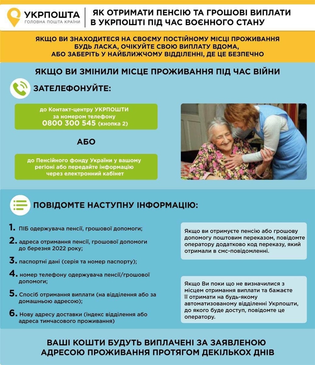 Якщо ви не виїжджали і перебуваєте на своєму постійному місці проживання, очікуйте на пенсію або іншу соціальну виплату вдома. Також можете забрати її у відділенні "Укрпошти" за графіком виплат.