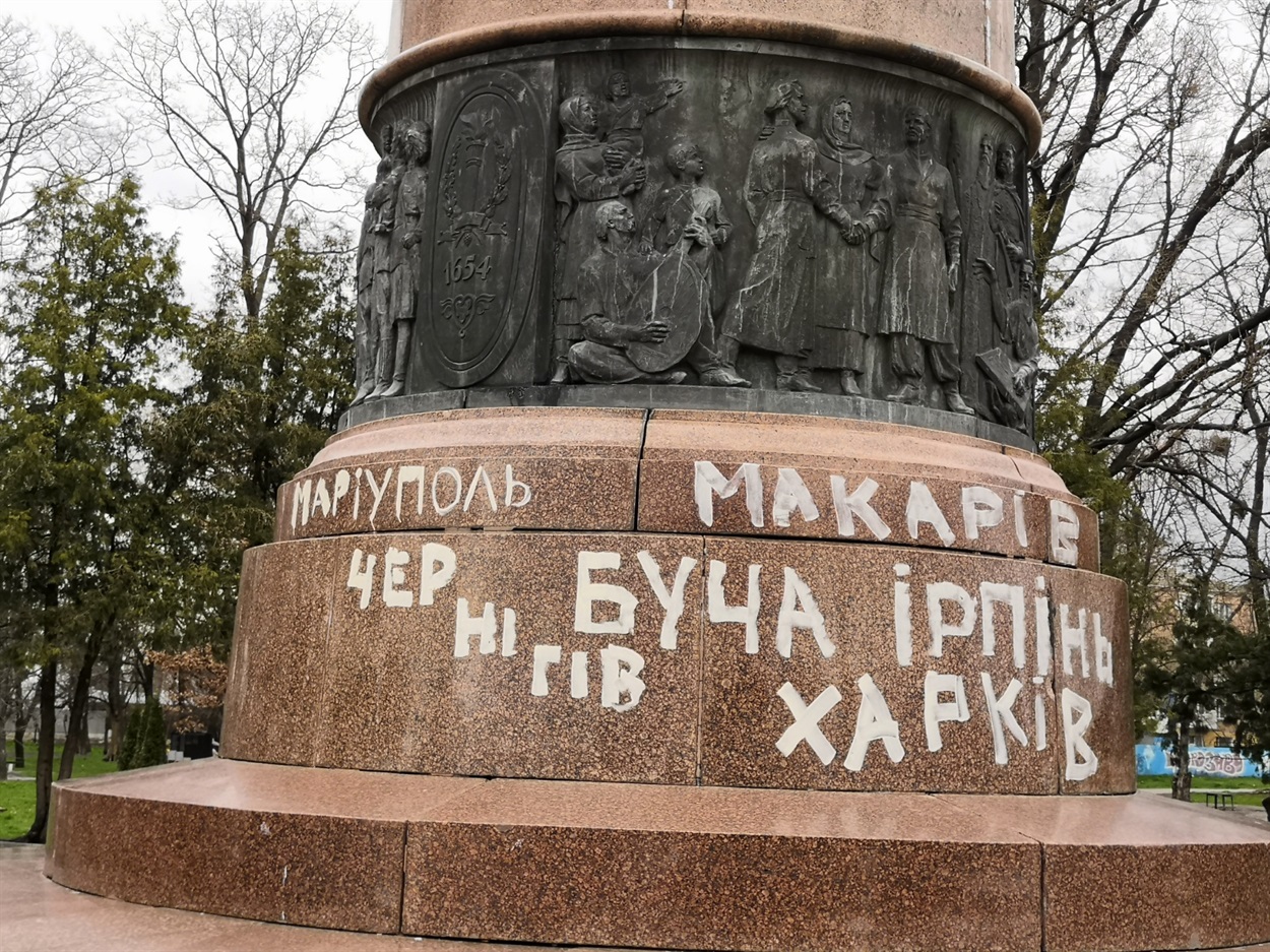 Ми кілька років лукаво ховали за ганчіркою напис: "навіки разом – навіки з російським народом". Аж тепер хоч ті буковки таки зірвали. Невдовзі замість них з'явилися інші: Буча, Маріуполь, Чернігів, Харків… Але те місце ще так пече очі і серця численним біженцям, які через наше місто мусять втікати як подалі від руйнівної і вбивчої російської агресії і не розуміють: де вони, чи тудою втікають і невже подібне досі має бути на сплюндрованій росією українській землі?!!!