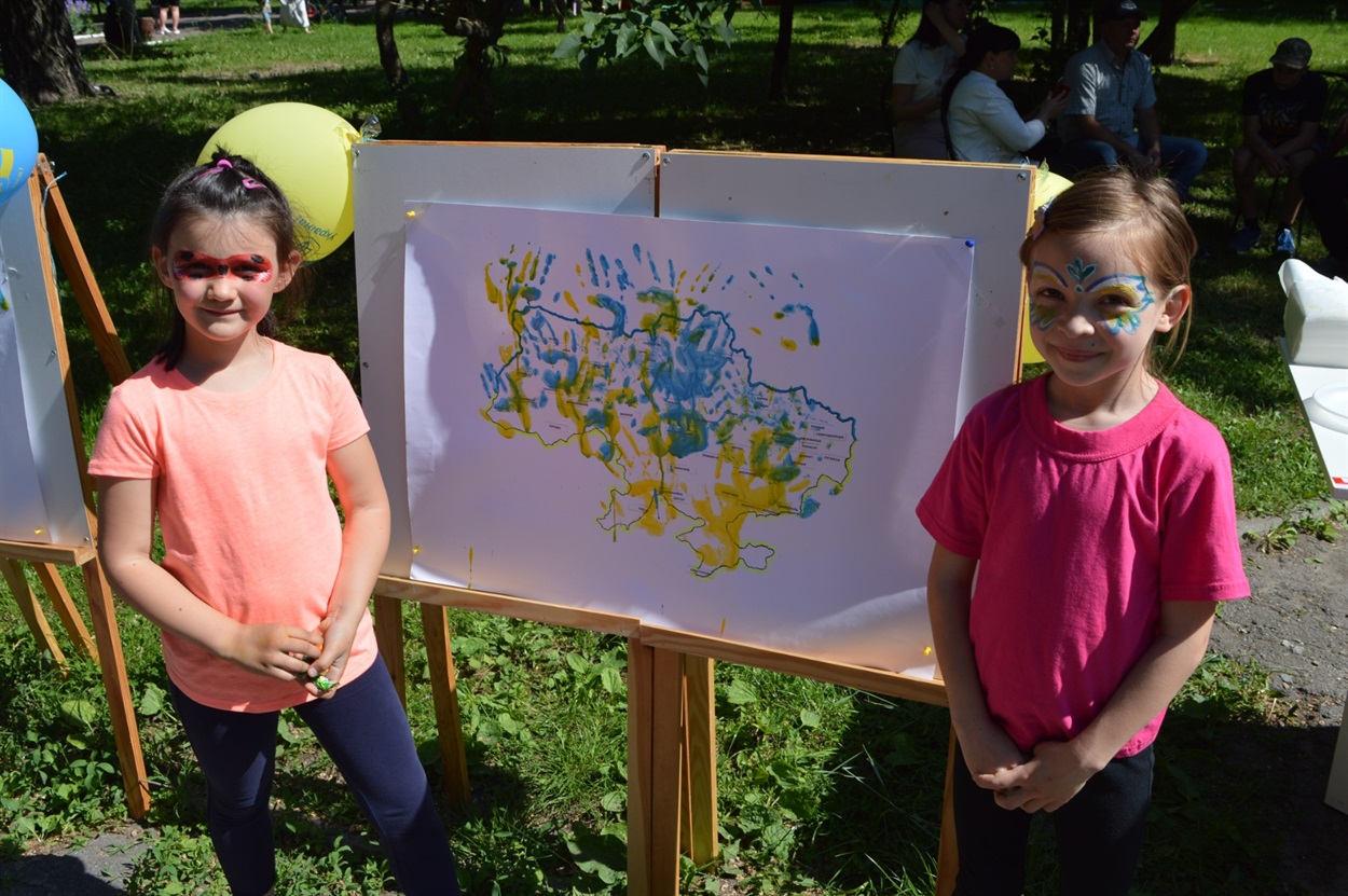 Охочі помалювати креативили і на асфальті – колективно різнокольоровими крейдами намалювали рушник, і на мольбертах – занурювали долоньки у фарби і "оживляли" карту України, разом з тим вивчаючи назви міст.