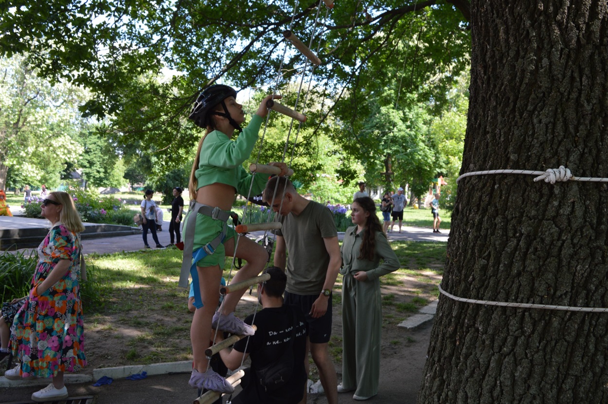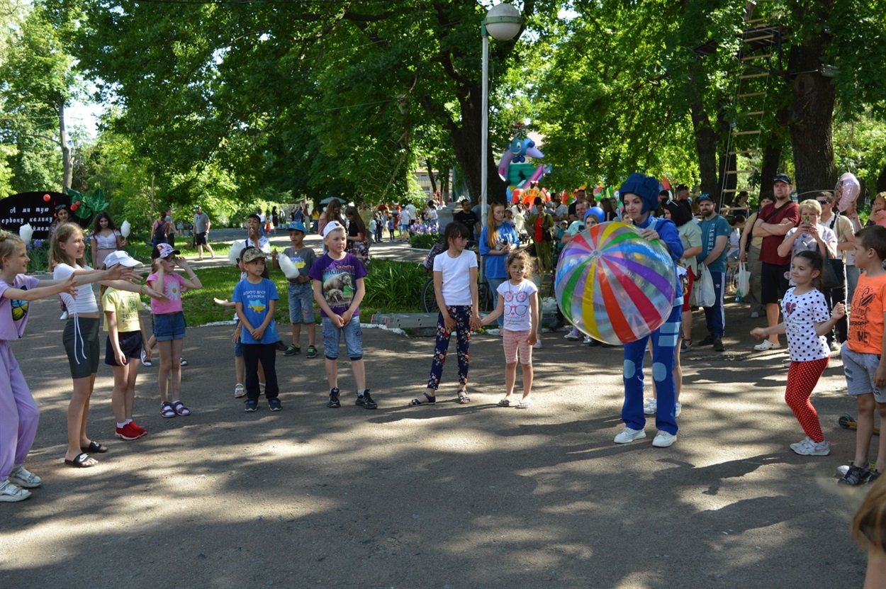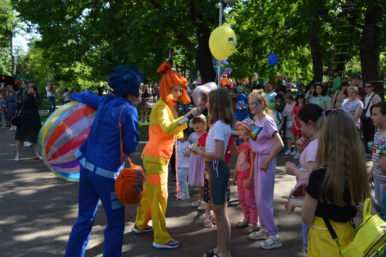 Всю паркову зону зайняли розважально-ігрові локації. Частина дітей бавилася з аніматорами в костюмах всім відомих мультяшних Фіксиків, стрибали на величезних надувних гірках та батутах, найспритніші обрали активний відпочинок на мотузкових атракціонах.