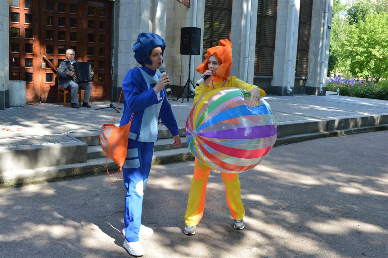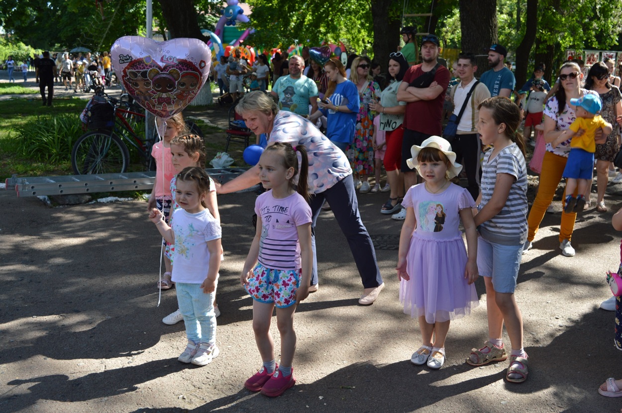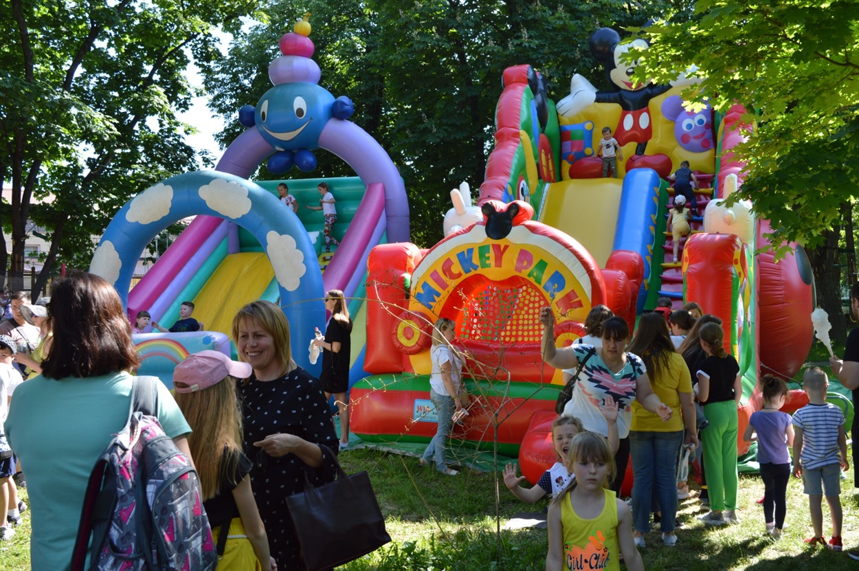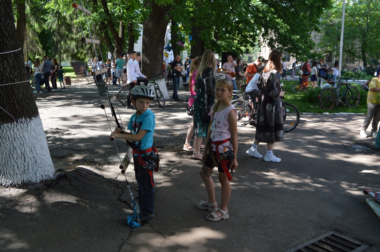 Всю паркову зону зайняли розважально-ігрові локації. Частина дітей бавилася з аніматорами в костюмах всім відомих мультяшних Фіксиків, стрибали на величезних надувних гірках та батутах, найспритніші обрали активний відпочинок на мотузкових атракціонах.