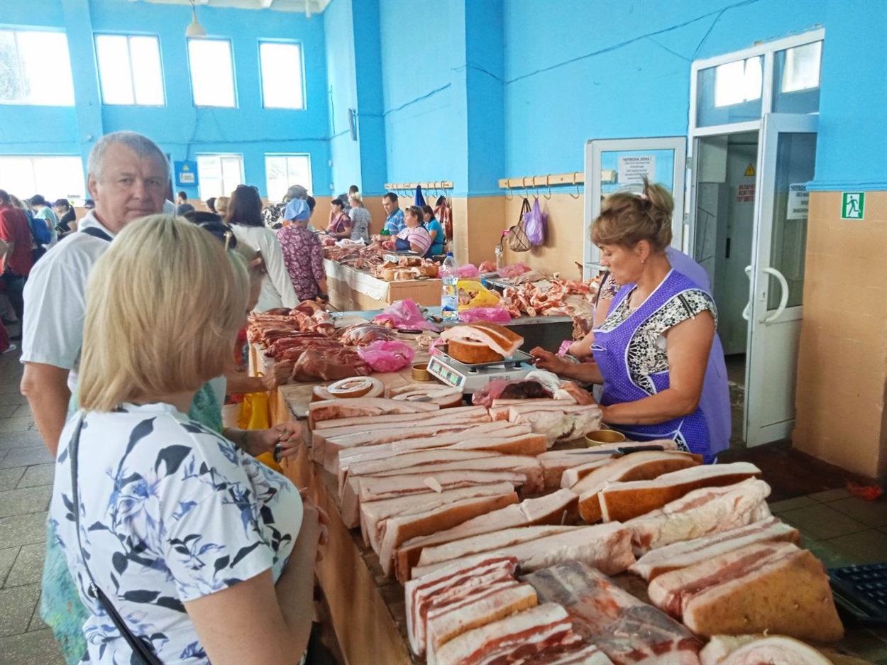 У м'ясному павільйоні найбільший попит спостерігався на сало, тож деякі з продавців наважилися поставити ціну на нього 200 грн за кіло. Однак і за 150 можна було виторгувати непогані шматки. Було й по 120. І це не якесь тоненьке, як картонка, а товщиною з 5 сантиметрів, просто воно, як сказала одна з продавчинь, «для жаріння».