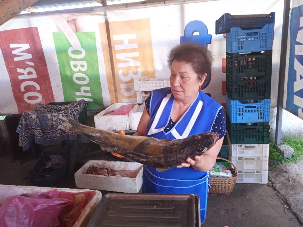 Живої річкової риби було обмаль. Привезли лише карасів (40-45 грн/кг), сомів та судаків (по 100). Один із судаків (на фото) заважив 5 кг! Причина мізерного асортименту не лише в тому, що все ще триває нерестовий період, а й тому, що в період воєнного стану вилов риби на відкритих водоймах суворо обмежений.
