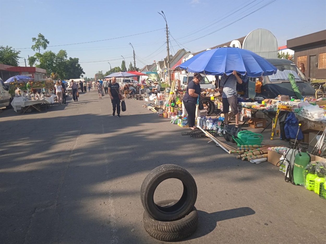 Проїзд для звичайного транспорту вулицею Шкільною закрито, тож, щоб про це нагадати тим, хто забув, продавці придумали спосіб – кладуть шини просто посеред дороги: не об'їдеш.
