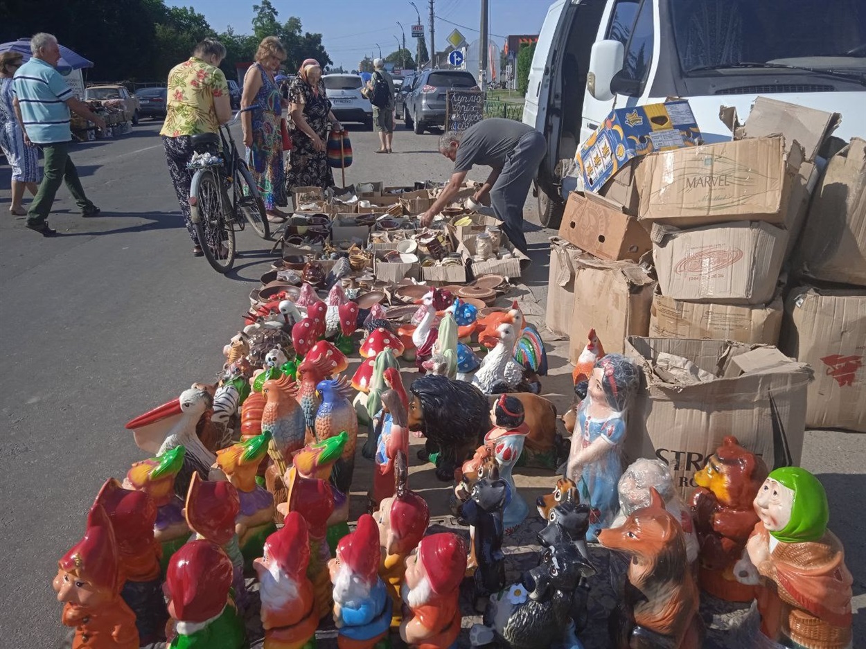 Неподалік від них, навпроти школи-інтернату, чоловік вже в який раз торгував керамічним посудом та садовими фігурками з глини. Фігурки коштували від 100 до 350 грн, а посуд, до якого був значно більший інтерес, – від 20 (за чашку) до 100 (за таріль).