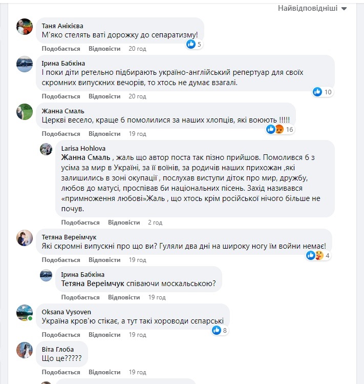 Larisa Hohlova: "Жаль що автор поста так пізно прийшов. Помолився б з усіма за мир в Україні, за її воїнів, за родичів наших прихожан, які залишились в зоні окупації , послухав виступи діток про мир, дружбу, любов до матусі, проспівав би національних пісень. Захід називався «примноження любові» Жаль, що хтось крім російської нічого більше не почув."