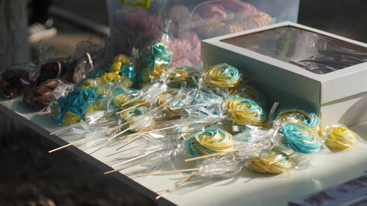 З імпровізованих прилавків швидко зникали солодощі 29-річної переяславки Ірини Шевченко. Смачним хобі жінка захоплюється близько 5 років. На ярмарок із нагоди Дня сім’ї завітала з сином. З маминих ласощів 8-річний Максимко найбільше полюбляє «патріотичні» синьо-жовті бізе.