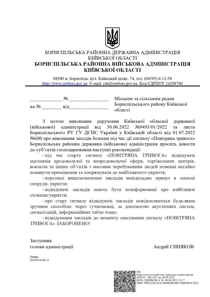 У Бориспільській районній військовій адміністрації розробили порядок дій для відвідувачів та персоналу закладів на території Бориспільського району під час повітряної тривоги.