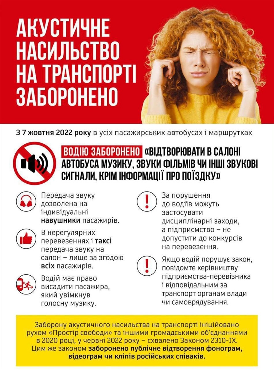 В Україні з пʼятниці, 7 жовтня, набуває чинності закон 2310-ІХ — він забороняє «акустичне насильство» у пасажирському транспорті.