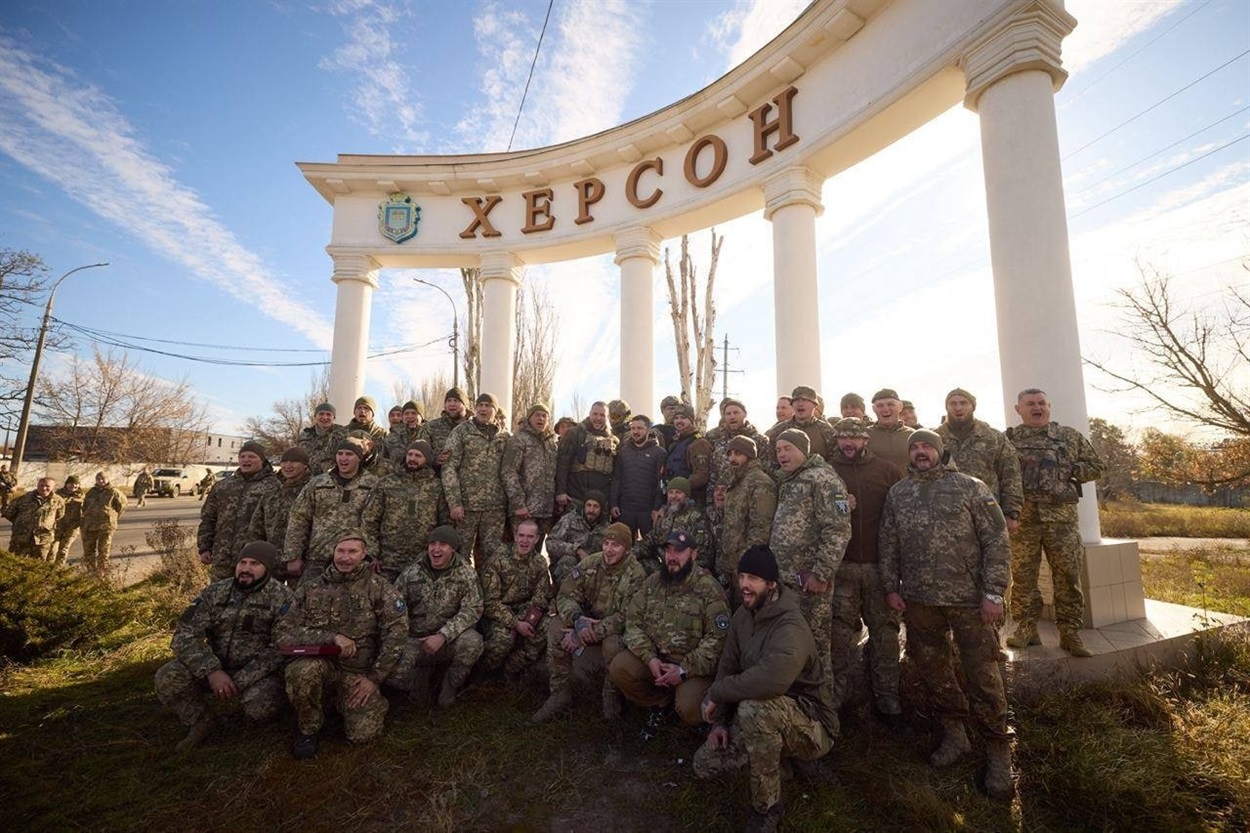 14 листопада у центрі Херсона відбулася церемонія офіційного підняття Державного прапора за участю Зеленського. Стяг на флагштоку піднімали військовослужбовці, лунав гімн України. Президент вручив воїнам державні нагороди.