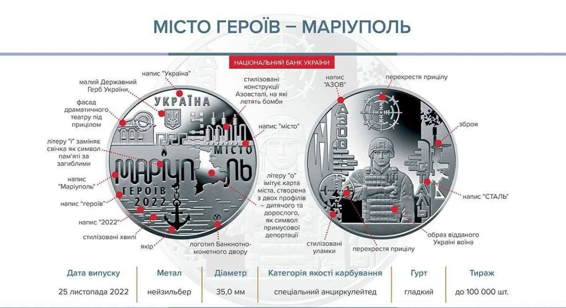 "У написанні слова "Маріуполь" літеру "і" заміняє свічка — це символ пам’яті за загиблими, а літера "о" імітує карту міста, створену з двох профілів – дитячого та дорослого, як символ примусової депортації", — розповіли у Нацбанку.