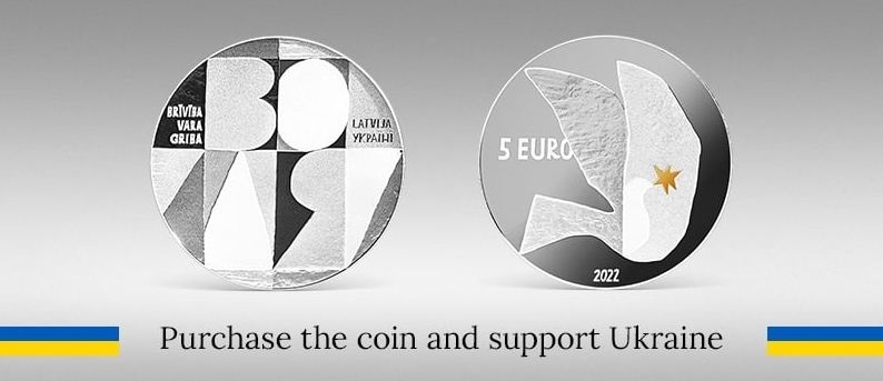 Центробанк Латвії випустив в обіг срібну колекційну монету "За свободу України"номіналом €5. Виручені від продажу кошти будуть пожертвовані на підтримку України