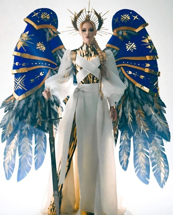 Національний комітет "Міс Україна Всесвіт" представив фотографії Вікторії у костюмі "Воїн світла". Дизайнерка символічного вбрання Леся Патока втілила образ Архангела Михаїла, котрий захищає Україну з мечем у руках.