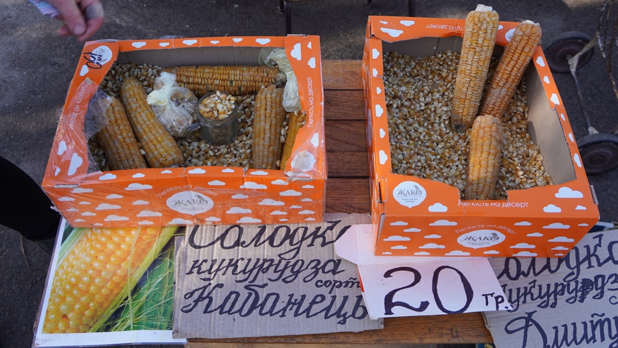 Як завжди, продавці зерна вишикувались по вулиці Грушевського. Відро пшениці продавали по 50 грн, кукурудзи – 40-50 грн, вівса – 45 грн, проса – 80 грн, макухи – 50-100 грн.