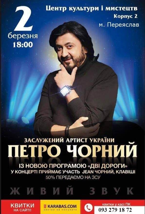 18:00 Концерт заслуженого артиста України Петра Чорного за адресою м. Переяслав, вул. Григорія Сковороди, 83 (Корпус № 2 , КЗ «Переяславський ЦКМ»). Замовлення квитків за телефоном +380932791872. Вартість: 180-300 грн.