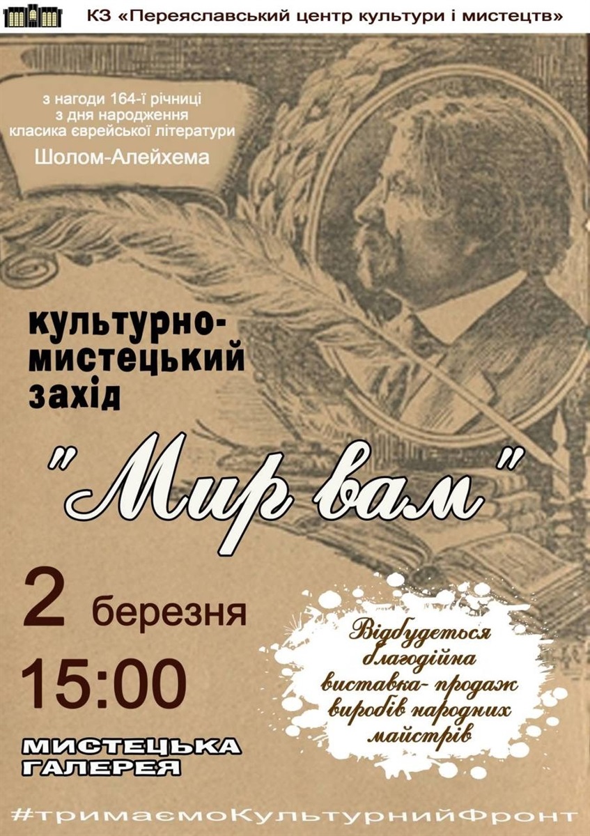15:00 Культурно-мистецький захід «Мир вам» з нагоди 164-ї річниці з Дня народження класика єврейської літератури Шолом-Алейхема та благодійна виставка-продаж виробів народних майстрів. Адреса: Мистецька галерея Центру культури та мистецтв (корпус 1). Вхід вільний.