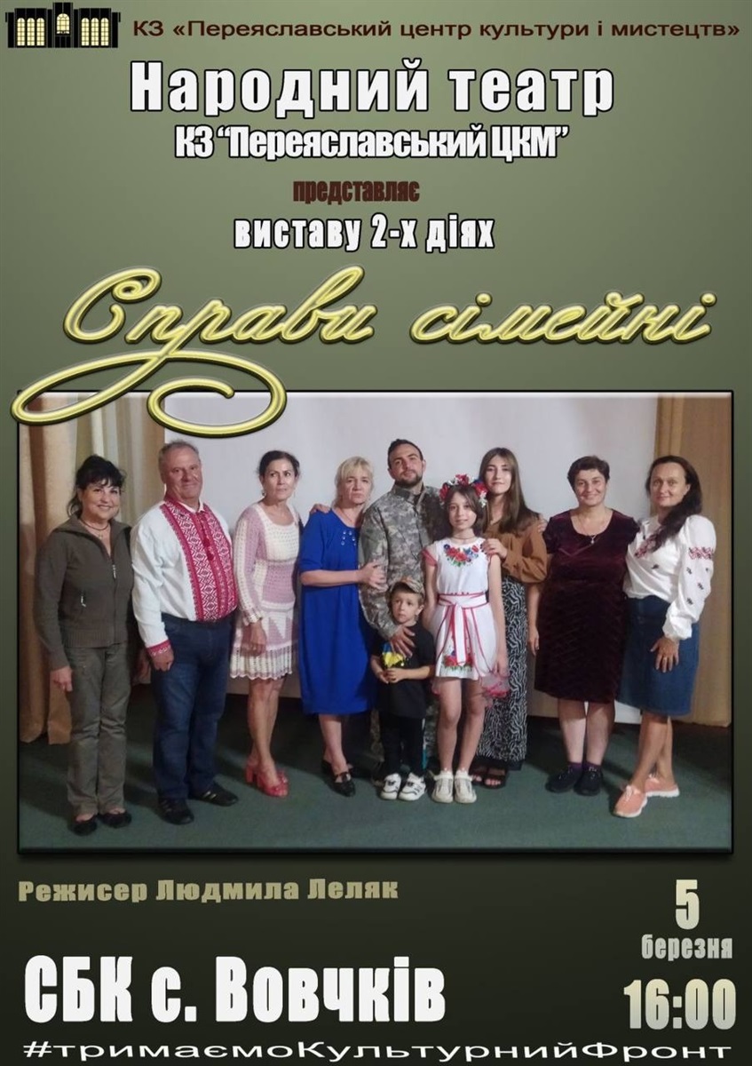 16:00 Вистава на дві дії «Справи сімейні» Народного театру Переяславського Центру культури й мистецтв від режисерки Людмили Леляк. Адреса: БК с. Вовчків. Вхід вільний.