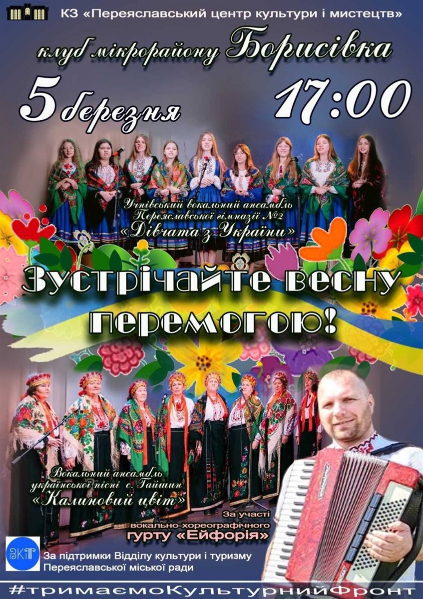 17:00 Концертна програма «Зустрічайте весну перемогою» за участі вокального ансамблю с. Гайшин «Калиновий цвіт» та вокально-хеографічного гурту «Ейфорія». Адреса: клуб мікрорайону Борисівка. Вхід вільний.