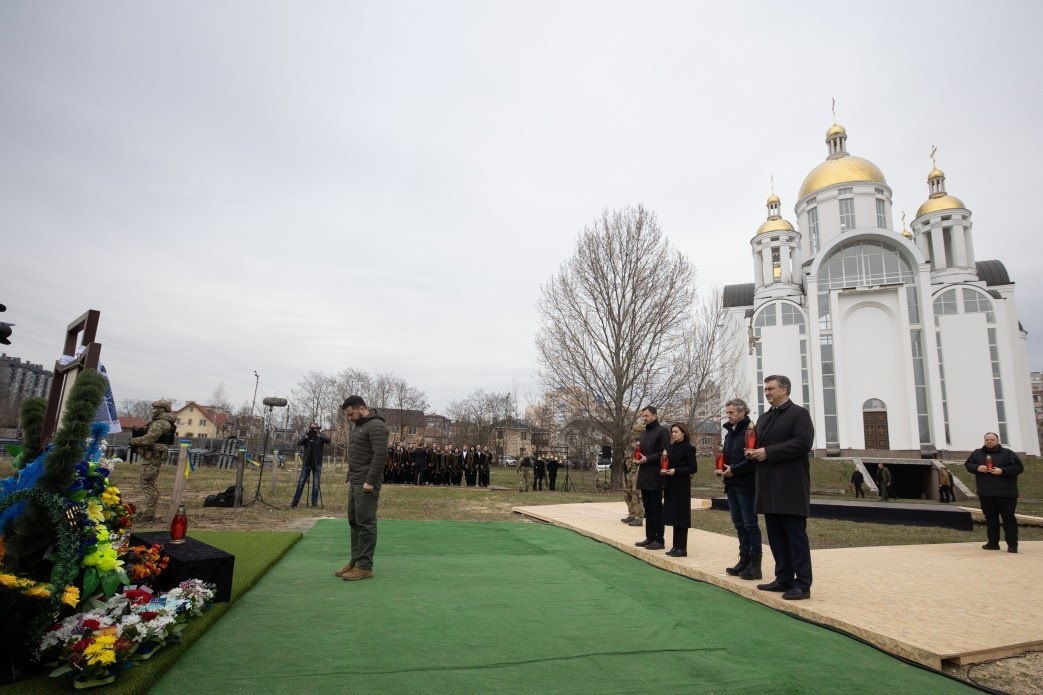 "Разом із Главою Української держави пам’ять загиблих ушанували: Президент Республіки Молдова Мая Санду, Прем’єр-міністр Словацької Республіки Едуард Хегер, Прем’єр-міністр Словенії Роберт Голоб, Прем’єр-міністр Хорватії Андрей Пленкович, а також Голова Верховної Ради Руслан Стефанчук, Прем’єр-міністр України Денис Шмигаль, керівник Офісу Президента Андрій Єрмак", – йдеться у повідомленні.