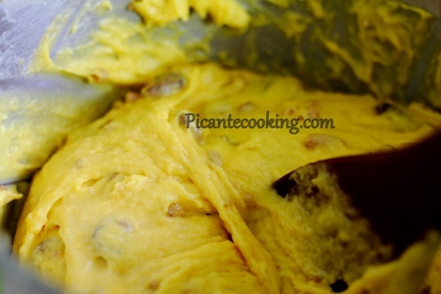 Вмісити сухофрукти та рідину, в якій вони замочувались, у тісто, гарненько вимішуючи його вдруге. Місити до рівномірного розподілу сухофруктів у тісті.