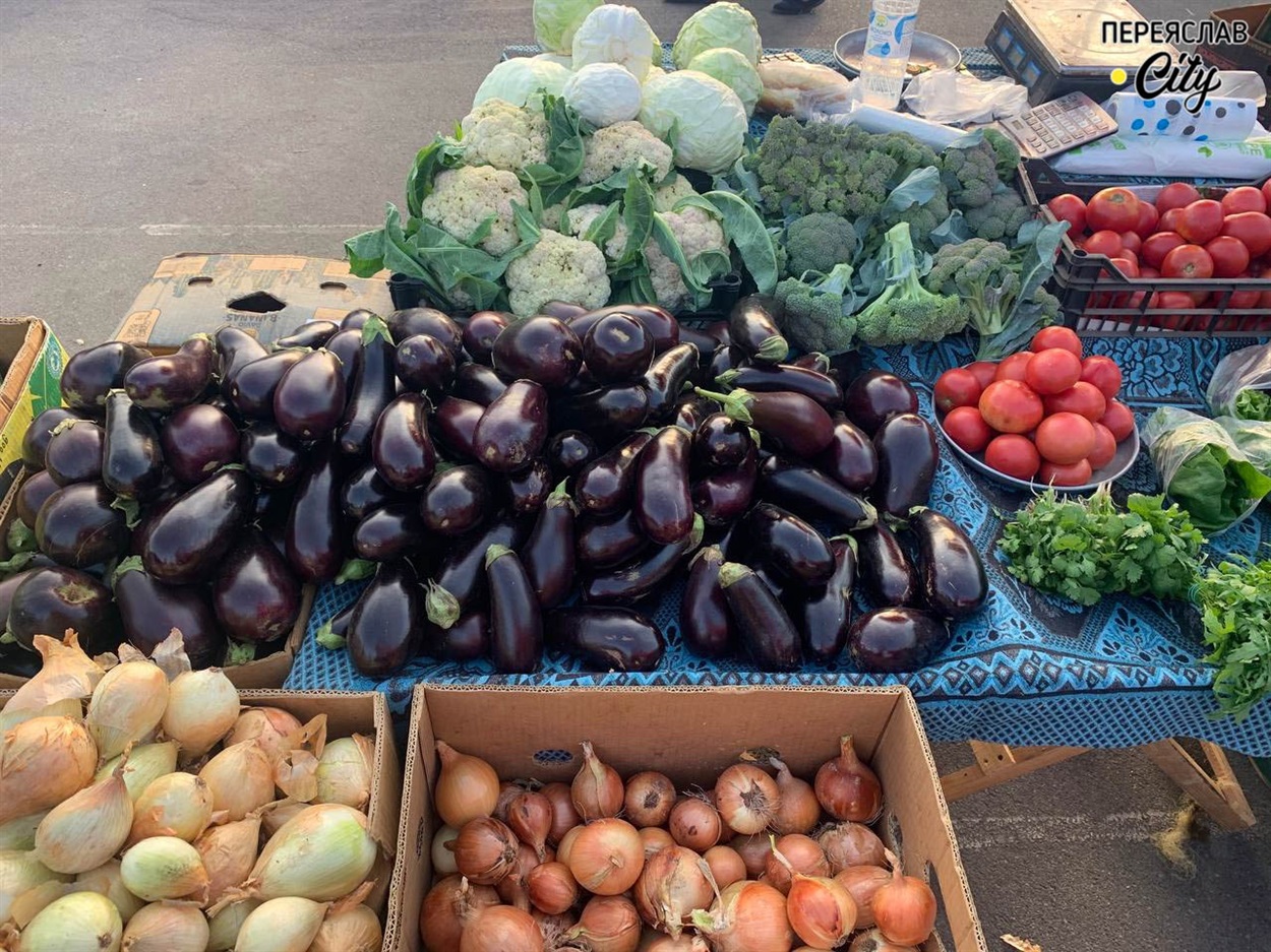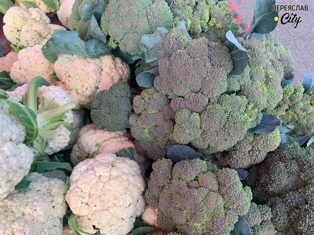 На овочевих прилавках багато цвітної капусти, броколі, баклажанів та зелені.