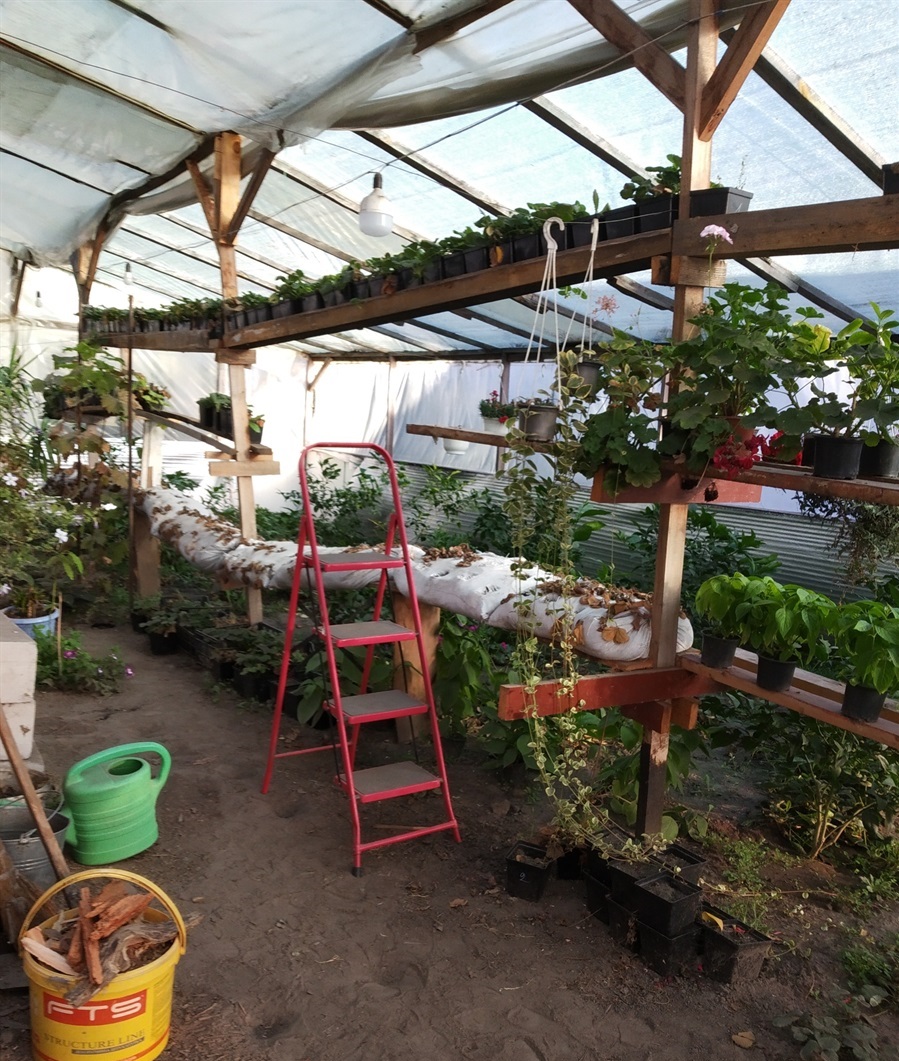 Першу теплицю зробив під будинком, щоб він захищав її від вітру. Саджаємо там розсаду, а зимою зберігаємо у ній гарбузи. Друга теплиця займає дві сотки, вона саме така, про яку мріяв: під склом, висока, зі стелажами та столами для рослин, має освітлення та обігрівається пічкою.