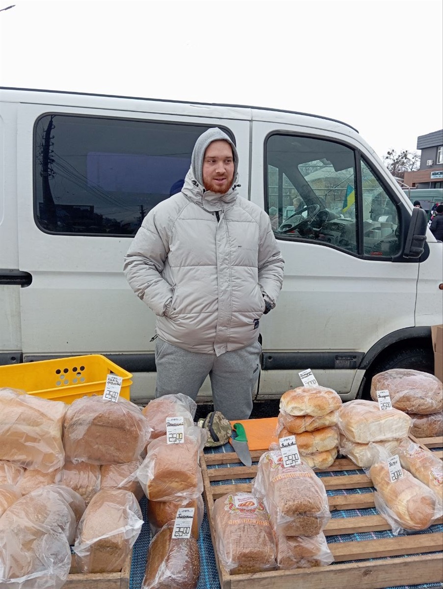 Біжу чимдуж по базару, бо холодно, і мій погляд випадково чіпляється за рум’яну високу паляницю, зовсім не схожу на ті, що продаються в маркетах. Поруч на прилавку – досить великий вибір: хліб «Висівковий», «Пікантний», «Домашній», «Житній», «Цеглинка формова», батони, пампушки з часником…