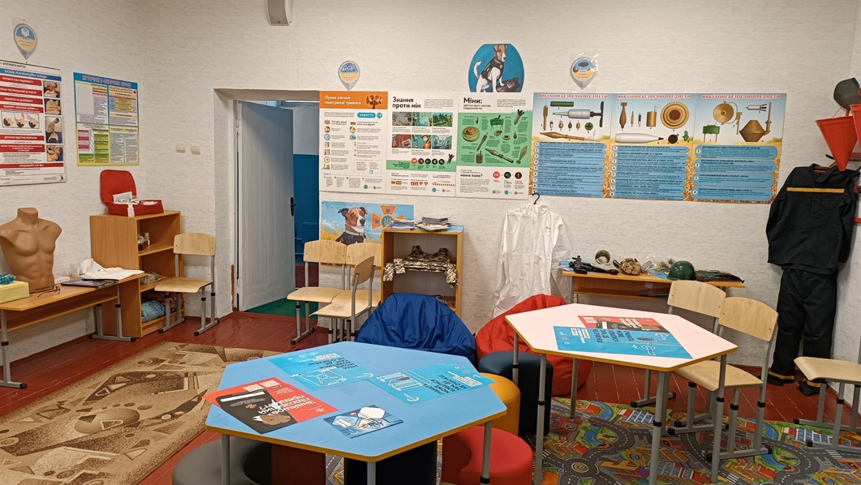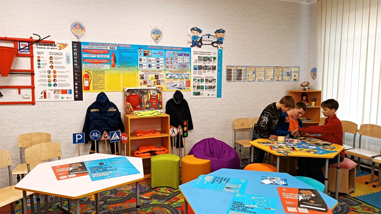 Обладнаний кабінет спеціальними муляжами вибухонебезпечних предметів, інвентарем для домедичної допомоги та протипожежної безпеки. Тут діти різних вікових груп зможуть в теорії і на практиці в ігровій формі навчатися правил безпеки, правил поведінки під час сигналу «Повітряна тривога», правил надання домедичної допомоги і ще багато чого.