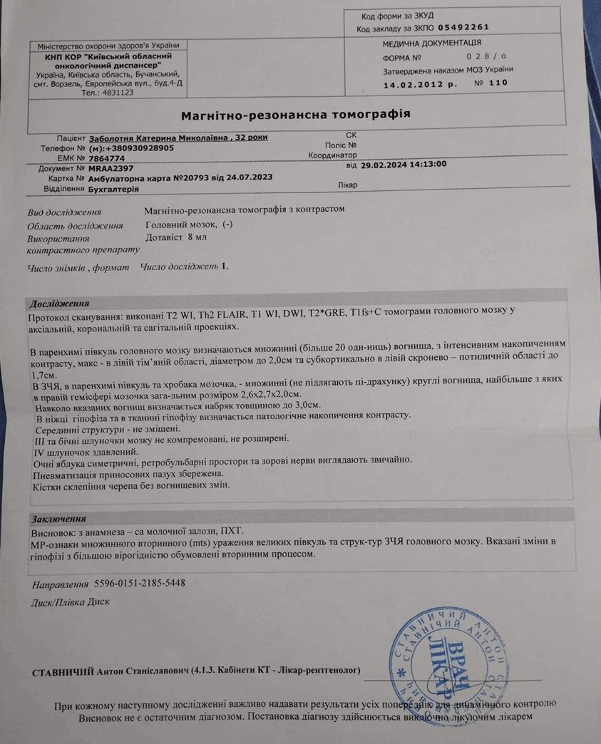 У січні 2024 року Катю прооперували. Все пройшло добре. Але з часом жінка стала погано почуватися і вирішила зробити МРТ-обстеження. Дослідження виявило, що злоякісна пухлина, яку видалили, дала метастази в головний мозок.