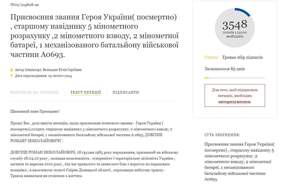 На сайті Офіційного представництва Президента України 29 лютого 2024 р. зареєстрована петиція щодо присвоєння почесного звання ДОВГИШУ Роману Миколайовичу (28.12.1985 – 10.09.2022).