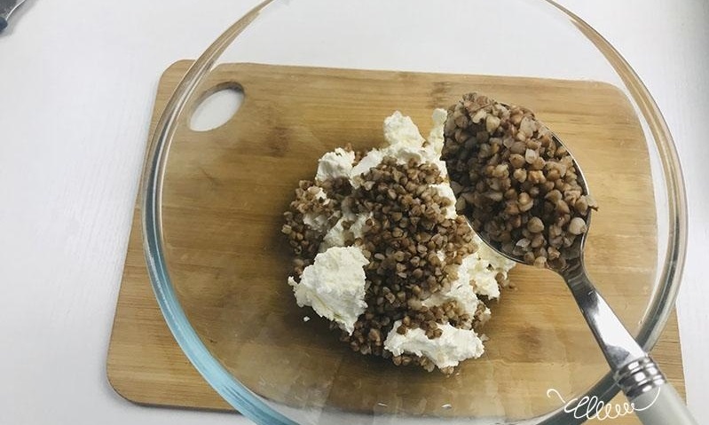 - Начинка. На пательні розігріти смалець чи олію й додати цибулю. Обсмажувати, часто помішуючи, до м'якості цибулі. Зняти з вогню й остудити. У глибокій мисці змішати гречку, домашній сир, бринзу, розім’яту руками або виделкою, цибулю, разом з жиром, на якому вона смажилась, й сіль та свіжо мелений чорний перець за смаком. Добре вимішати.