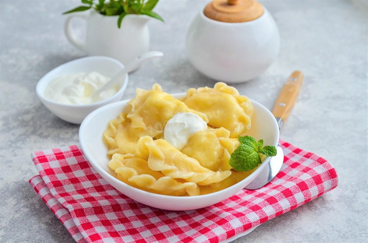 - Подача страви. Вареники із сиром одразу заправити вершковим маслом і подавати зі сметаною.