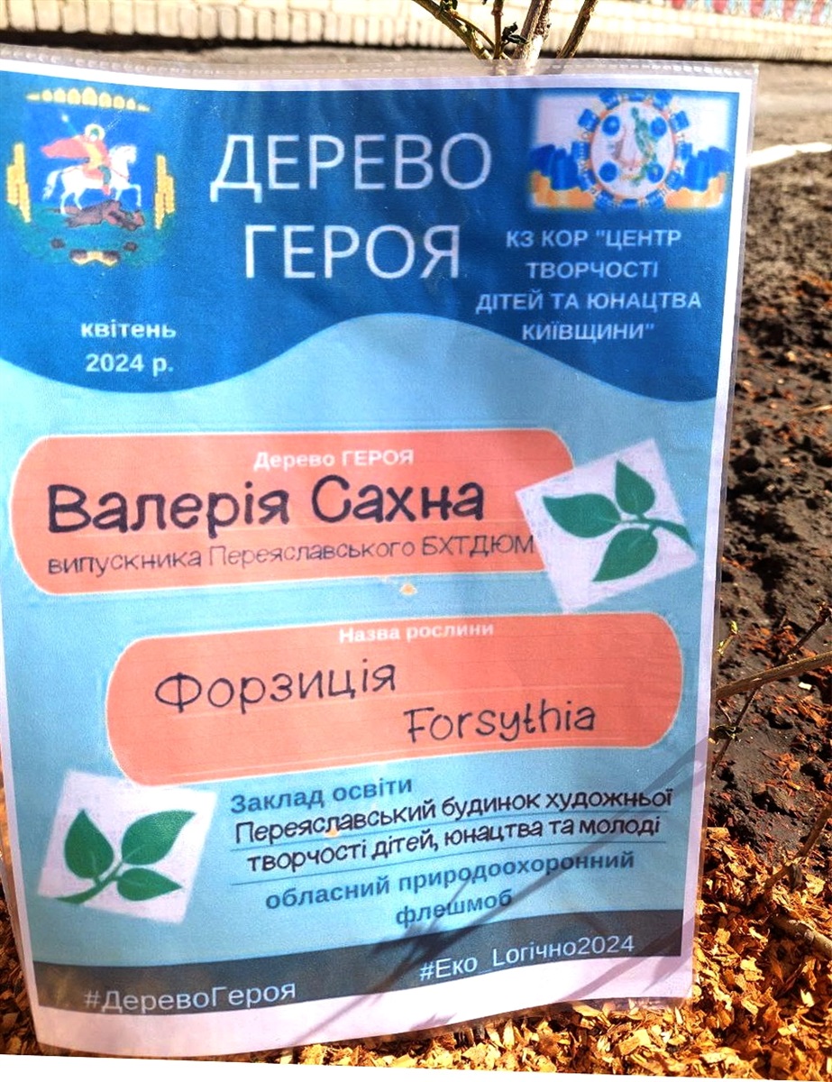 Вихованці Переяславського будинку художньої творчості дітей, юнацтва та молоді у пам'ять про загиблого Героя з Переяслава Валерія САХНА, випускника цього закладу, висадили форзицію на клумбі перед будівлею. Так вони долучилися до обласного флешмобу "Дерево Героя".