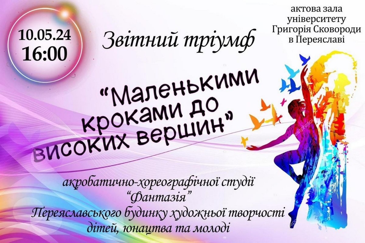 Завітайте на звітний виступ "Маленькими кроками до високих вершин" від акробатично-хореографічної студії "Фантазія" Переяславського будинку художньої творчості дітей, юнацтва та молоді.