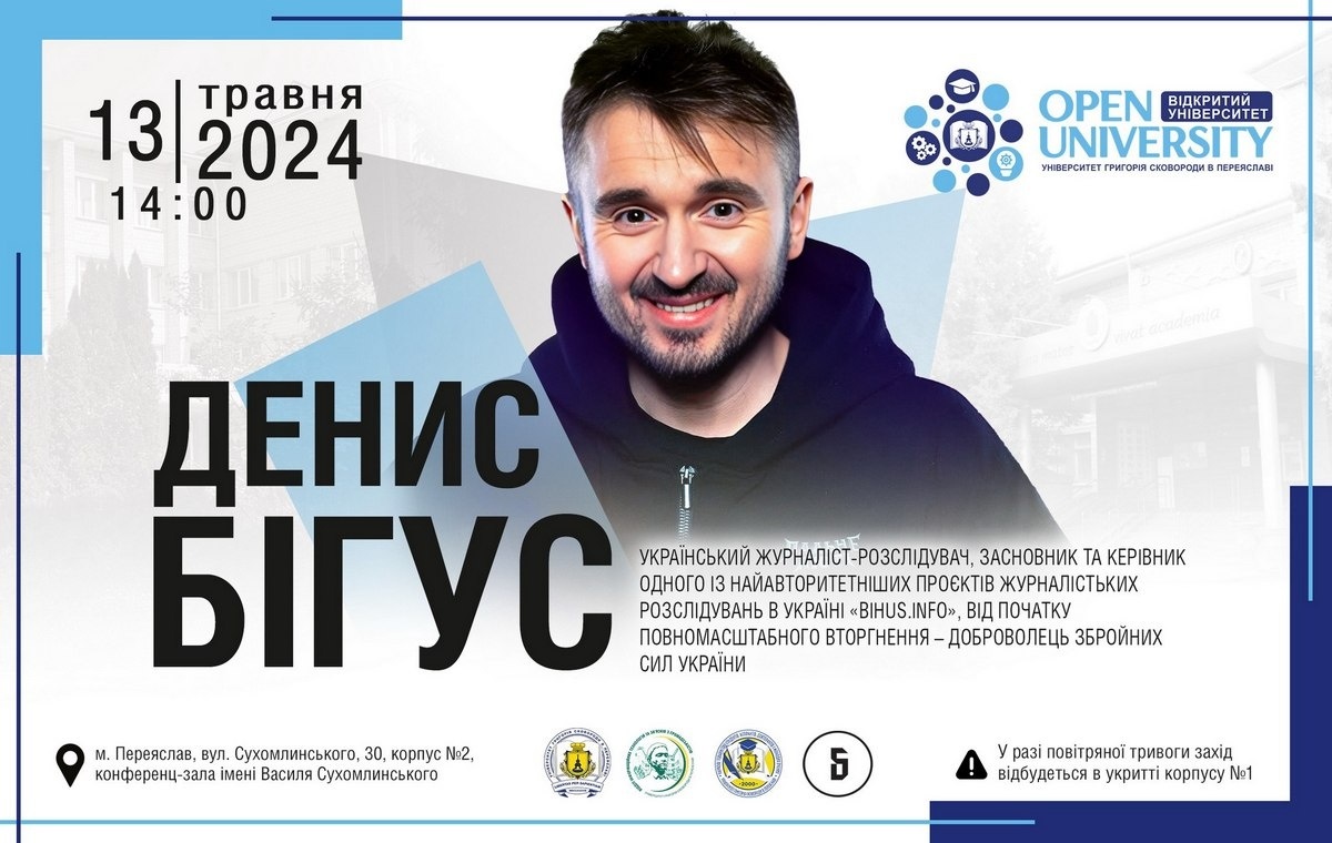 У рамках проєкту Open University гостем університету стане відомий журналіст-розслідувач, засновник та керівник Bihus.Info, від початку повномасштабного вторгнення доброволець Збройних сил України Денис Бігус.
