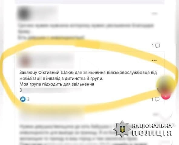 28-річна жителька Миколаївської області розробила злочинну схему ухилення осіб призовного віку від мобілізації, шляхом укладення фіктивного шлюбу з жінками з інвалідністю. Свої послуги порушниця пропонувала за грошову винагороду через Telegram канал. Їй загрожує до дев'яти років позбавлення волі.
