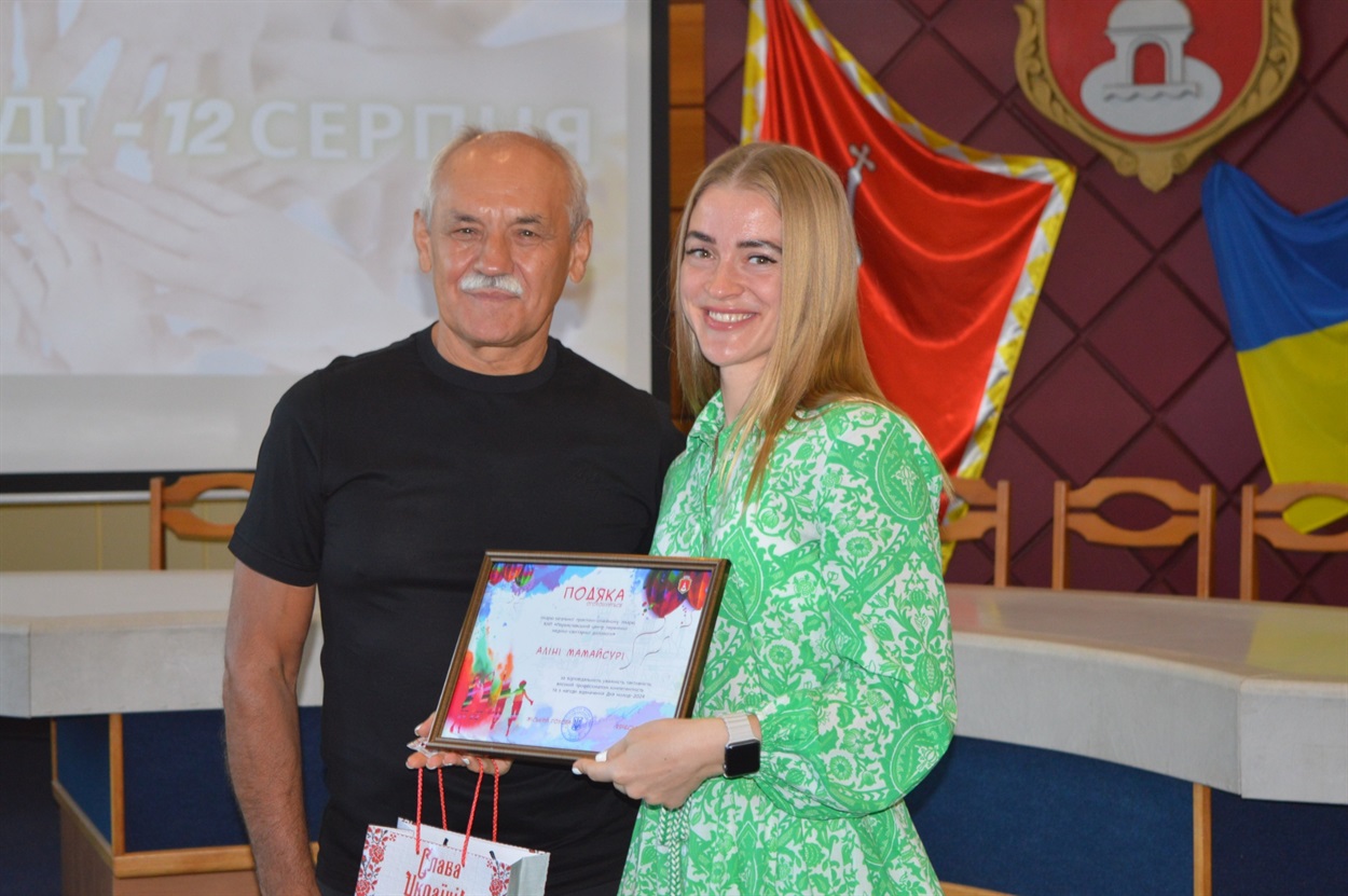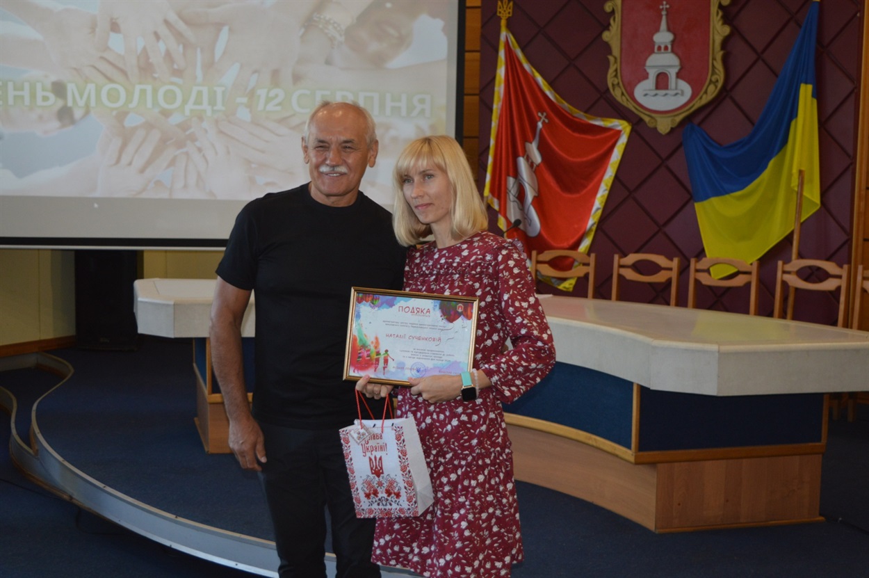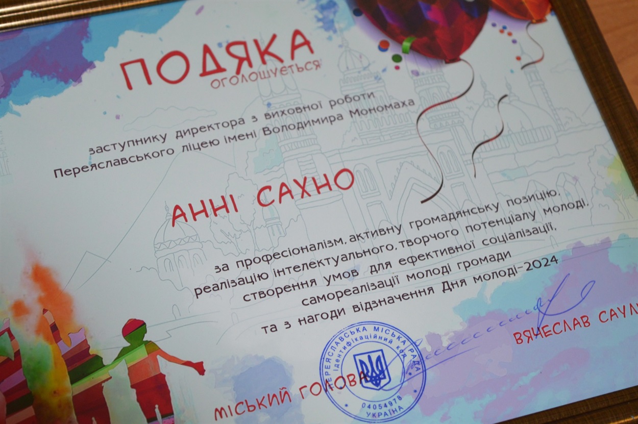 Анна Слива, членкиня Міської ради Дітей Переяслава, отримує подяку від міської ради з нагоди Дня молоді України