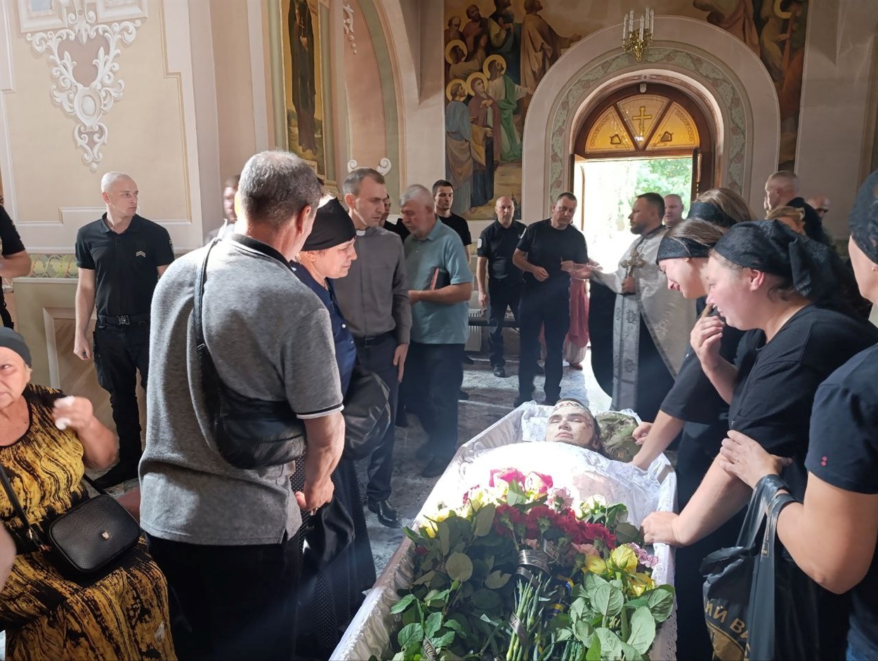 Спочатку родина та решта людей могли попрощатися з полеглим поліцейським на подвір'ї його родинного помешкання.