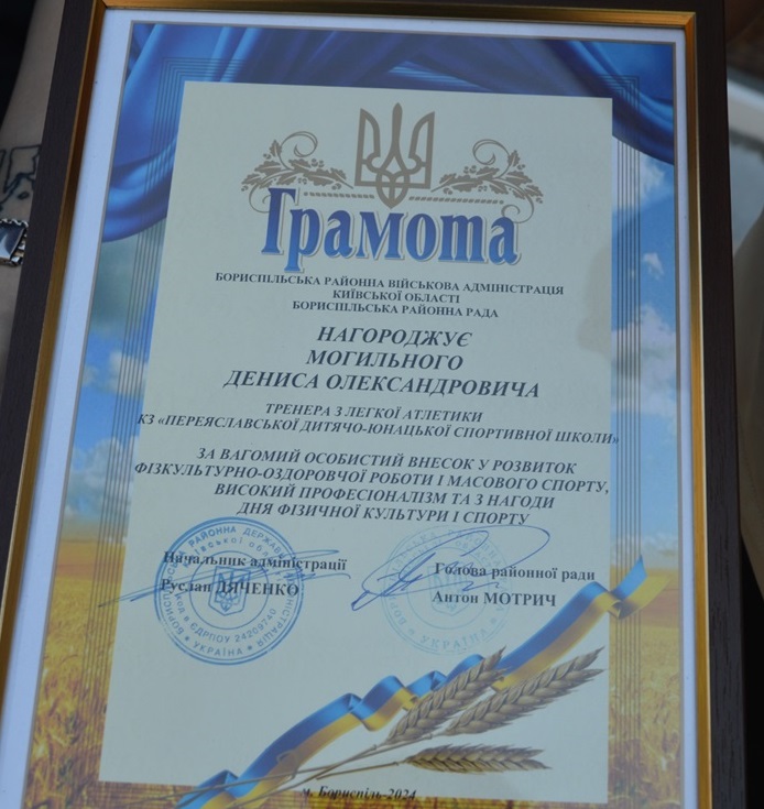 Серед нагороджених – Денис Могильний, тренер з легкої атлетики Переяславської дитячо-юнацької спортивної школи (ДЮСШ). Він тут працює понад три роки. Нині на постійній основі його персональні заняття відвідують 8 школярів, хлопці з ним від початку, дівчата – новенькі.