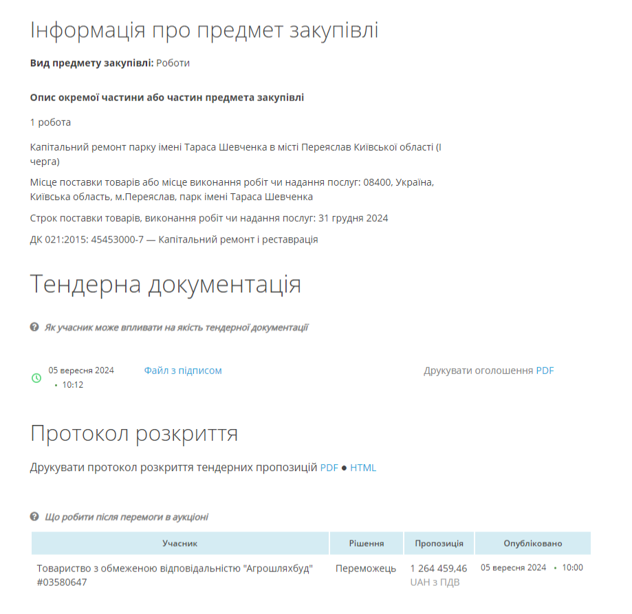 Через місяць після згоди депутатів виділити подвійну суму на бруківку в парку, 5 вересня відділ капітального будівництва та житлово-комунального господарства Переяславської міськради уклав угоду прямої закупілі (без тендеру) на виконання робіт.