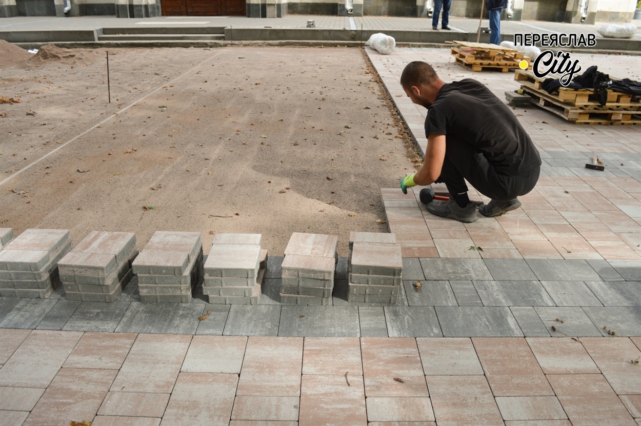 До кінця вересня підрядники встигли викласти близько половини. Для цього об'єкту обрали плитку, відмінну від тої, якою викладено нові тротуари в місті. Тут працюють з пласкою різнорозмірною двох кольорів, нею на всій площині "малюють" нескладну геометрію.