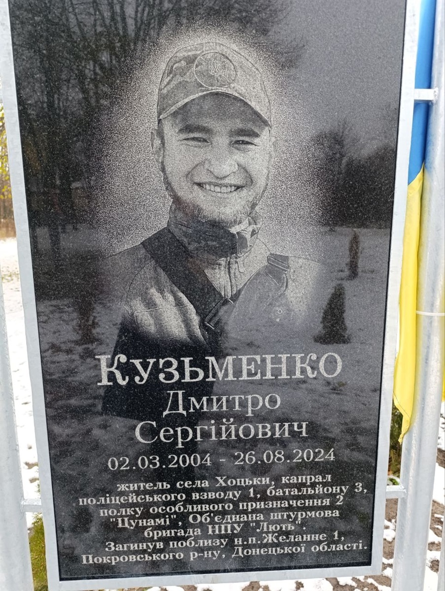 Назавжди 20… Дмитро Сергійович Кузьменко народився 2 березня 2004 року. Дмитро ніс службу в лавах Національній поліції України. Був капралом поліцейського взводу 1, батальйону 3, полку особливого призначення 2 "Цунамі" Об'єднаної штурмової бригади НПУ "Лють". Загинув 26 серпня 2024 року поблизу селища Желанне Перше Покровського району на Донеччині.