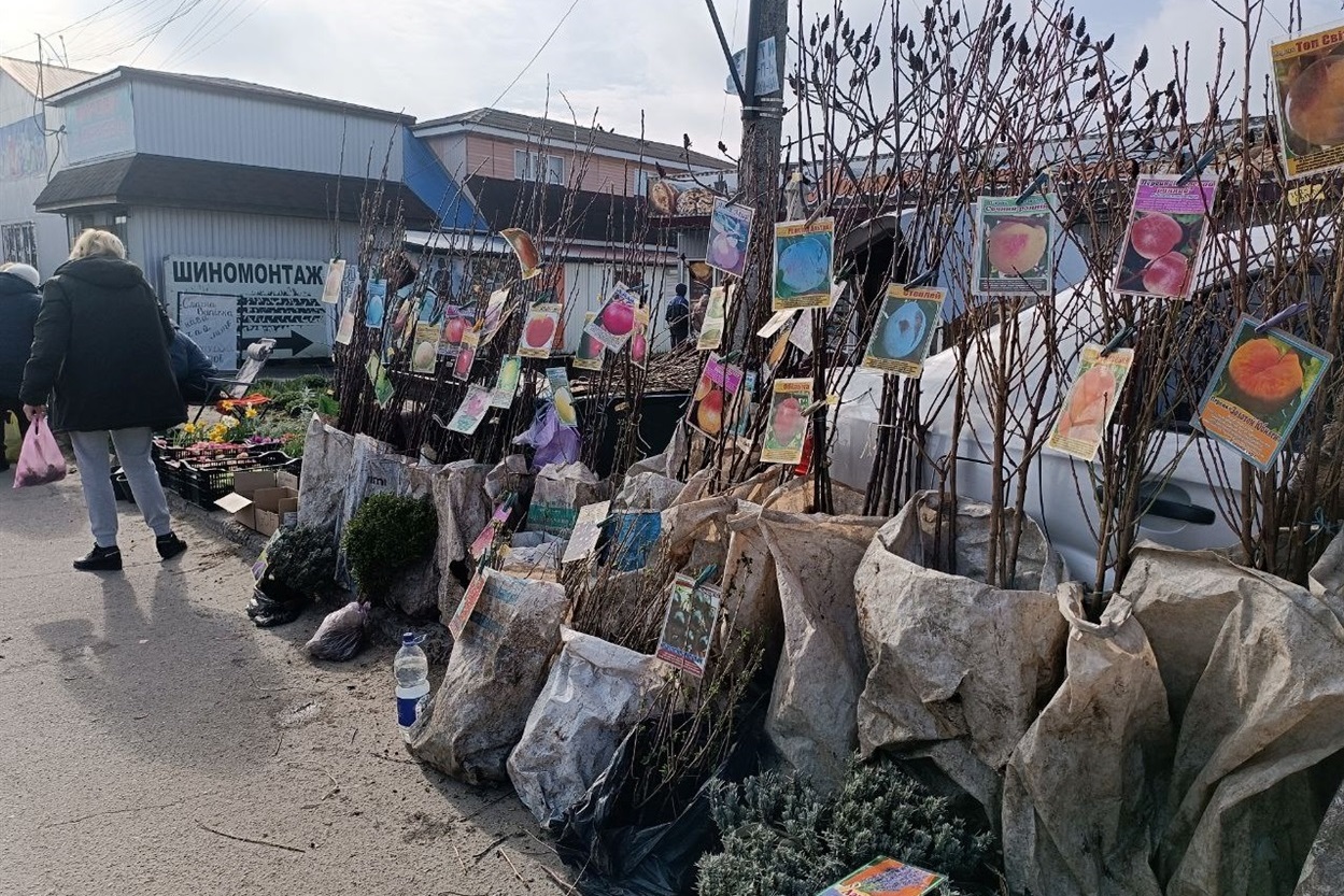 – Уже третій тиждень торгую тут деревами. Люди беруть потрошку. Усі жаліються на війну, але дерева садять – життя продовжується. Яблуньки й грушки продаю по 150 гривень, кісточкові – по 200. Виноград в асортименті також по 200 гривень, – розповідає продавець Анатолій із Золотоноші.