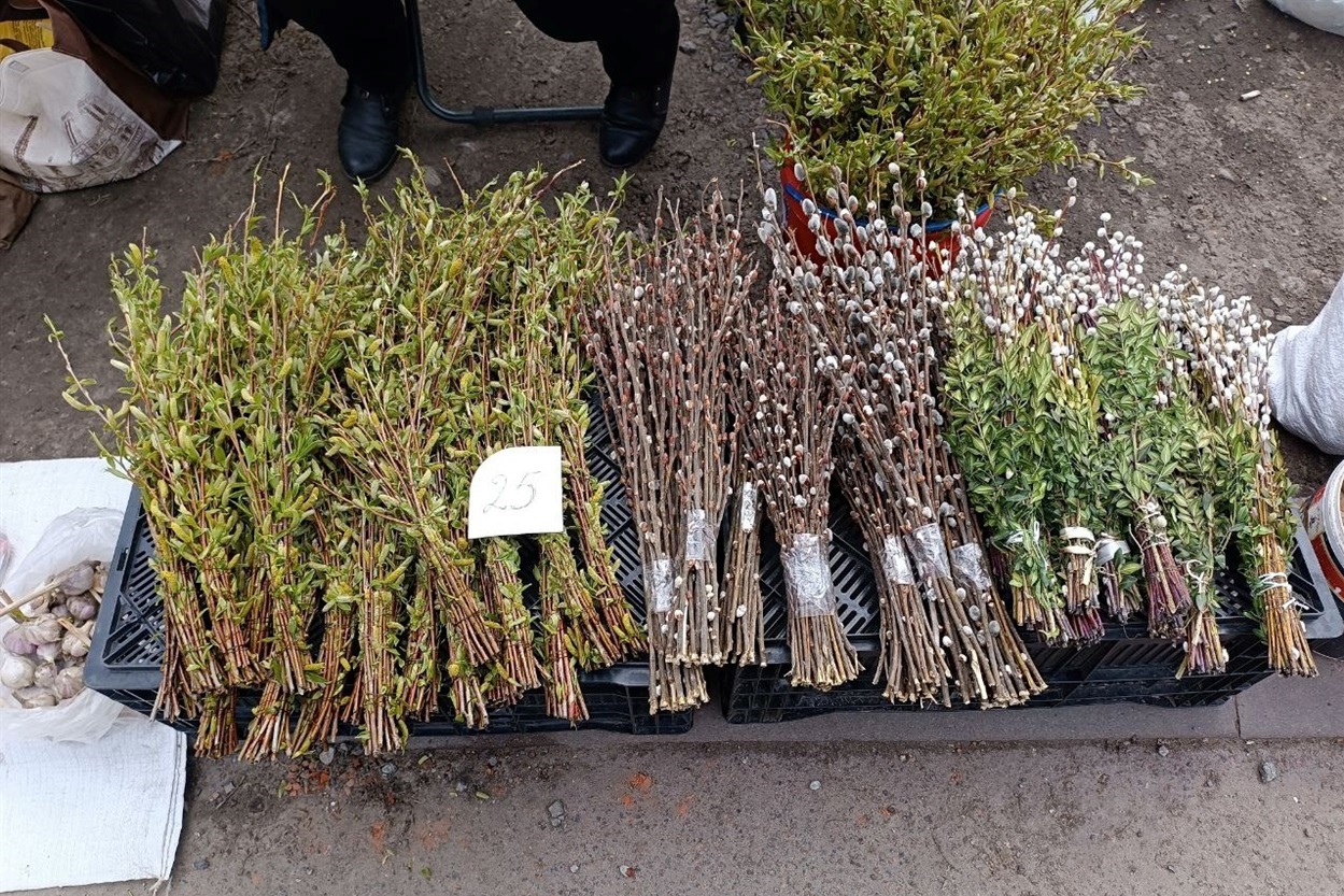 Куди ж на Вербну неділю без букетиків верби? Їх винесли чимало – по 30–50 гривень за один. Водночас посвячених у церкві гілочок на продаж не було.