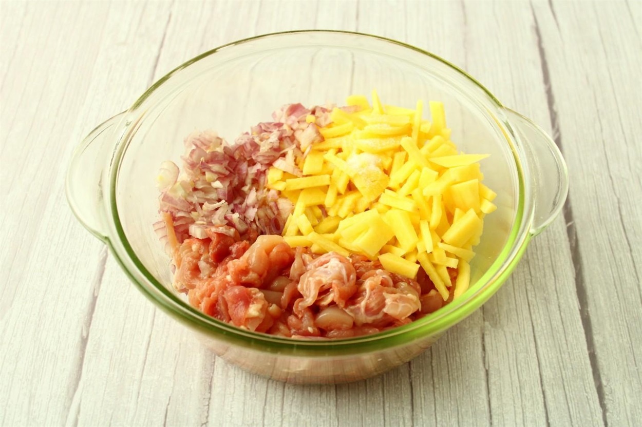 - Наріжте куряче філе дрібними шматочками. Промийте картоплю, очистіть і наріжте її тонкою соломкою. Ви можете вибрати форму та розмір нарізки інгредієнтів на свій смак, але пам'ятайте, що чим дрібніше вони нарізані, тим швидше пиріг приготується. Подрібніть цибулю за допомогою блендера або ножа. У глибокій мисці змішайте куряче філе, картоплю, цибулю, зелень та спеції. Добре перемішайте.