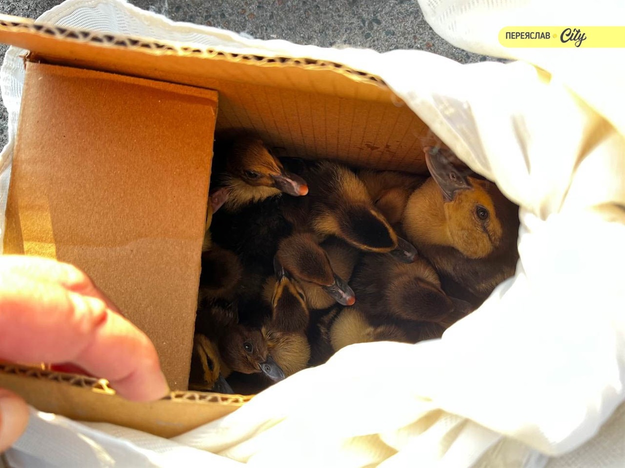 Беру до рук полотняну торбинку, а в ній – коробка. Поки ми знайомимося, з торби випадає одне каченя. Ловимо його між ногами перехожих. Впіймали.