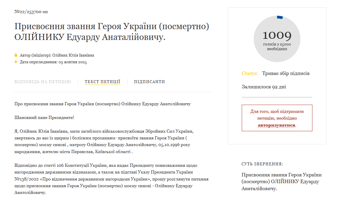Про присвоєння звання Героя України (посмертно) Олійнику Едуарду Анатолійовичу, морському піхотинцю з Переяслава, клопоче його мати Юлія Олійник. Відповідна електронна петиція №22/253700-еп на Офіційному інтернет-представництві Президента України оприлюднена 3 жовтня. Переяслав.City закликає не залишатися осторонь і підтримати ініціативу своїм підписом.
