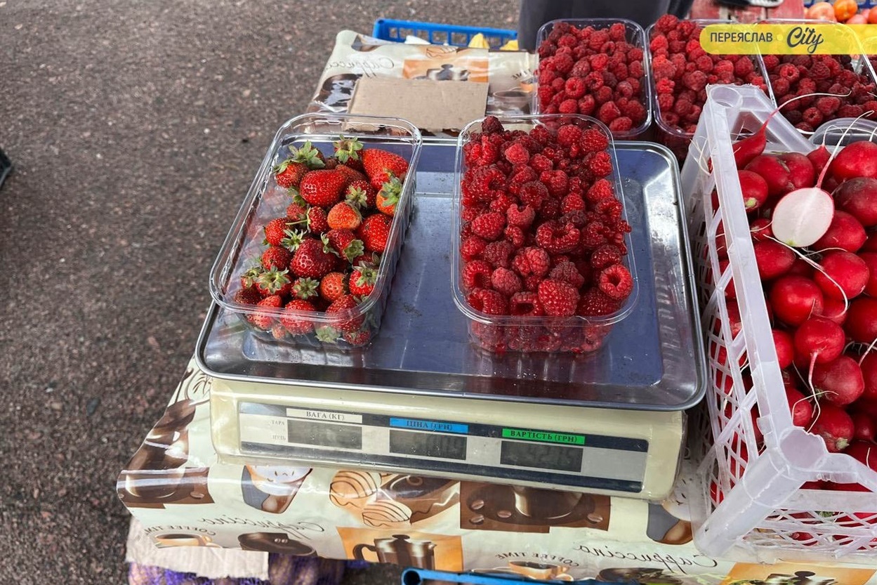Малину продають по 50 гривень за стакан або 200 гривень за кілограм. І ще можна знайти полуницю, продавці кажуть, що в цьому сезоні вона остання – по 250 гривень за кілограм.