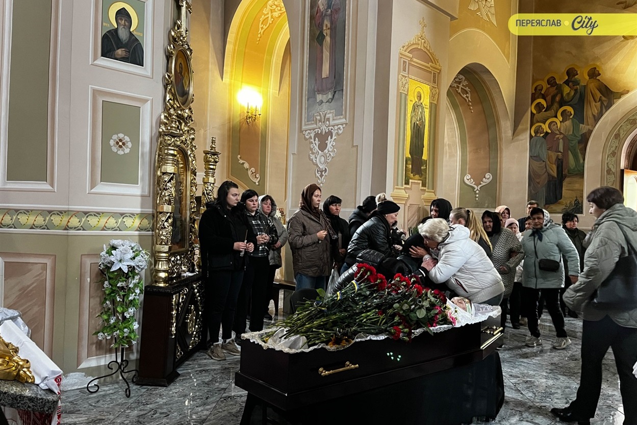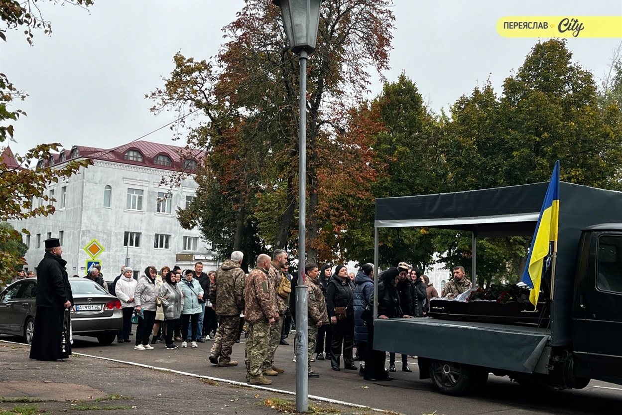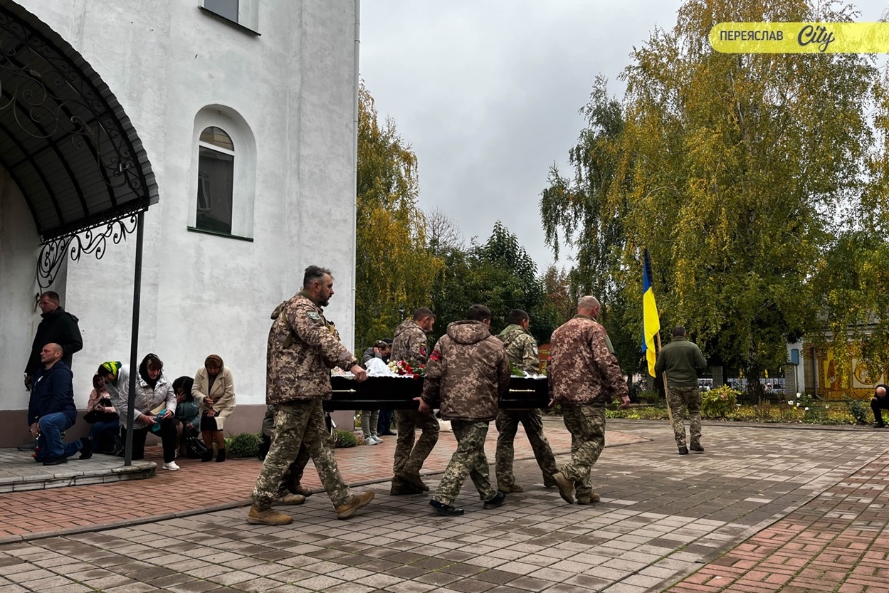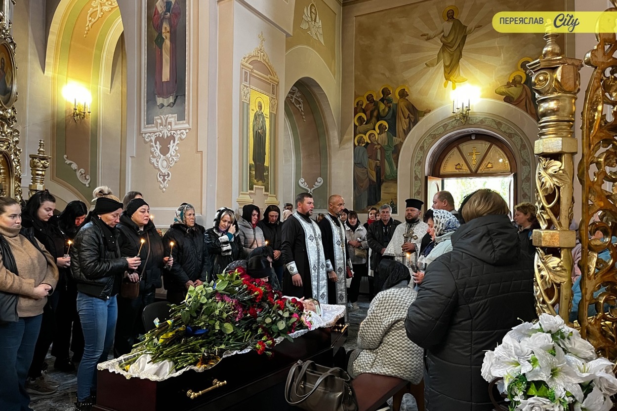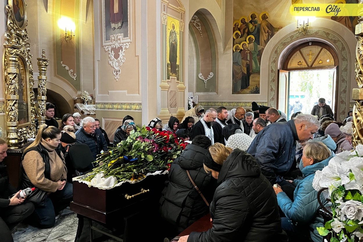 7 жовтня траурний кортеж із тілом Героя пішою ходою рушив від родинного дому на Гімназійній вулицями Переяслава до Воскресінського храму. Там присутні схилилися на коліно, коли військові переносили труну з катафалка до церкви. Зазвичай люди йдуть слідом за домовиною, але цього разу більшість рушила до храму вже після того, як труну занесли всередину.
